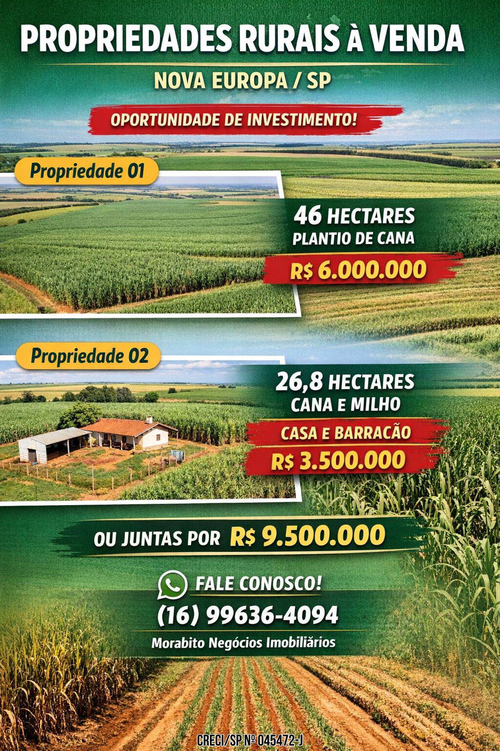 Duas excelentes oportunidades para investimento agrícola, com possibilidade de aquisição individual ou conjunta.