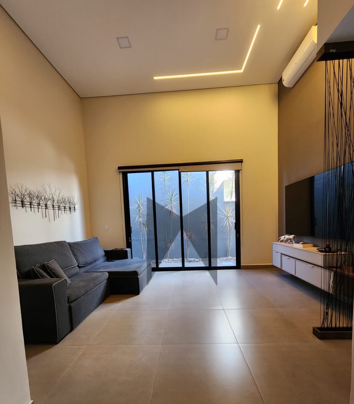 🔹 Sala: Pé direito alto, iluminação LED, móveis planejados, ar condicionado