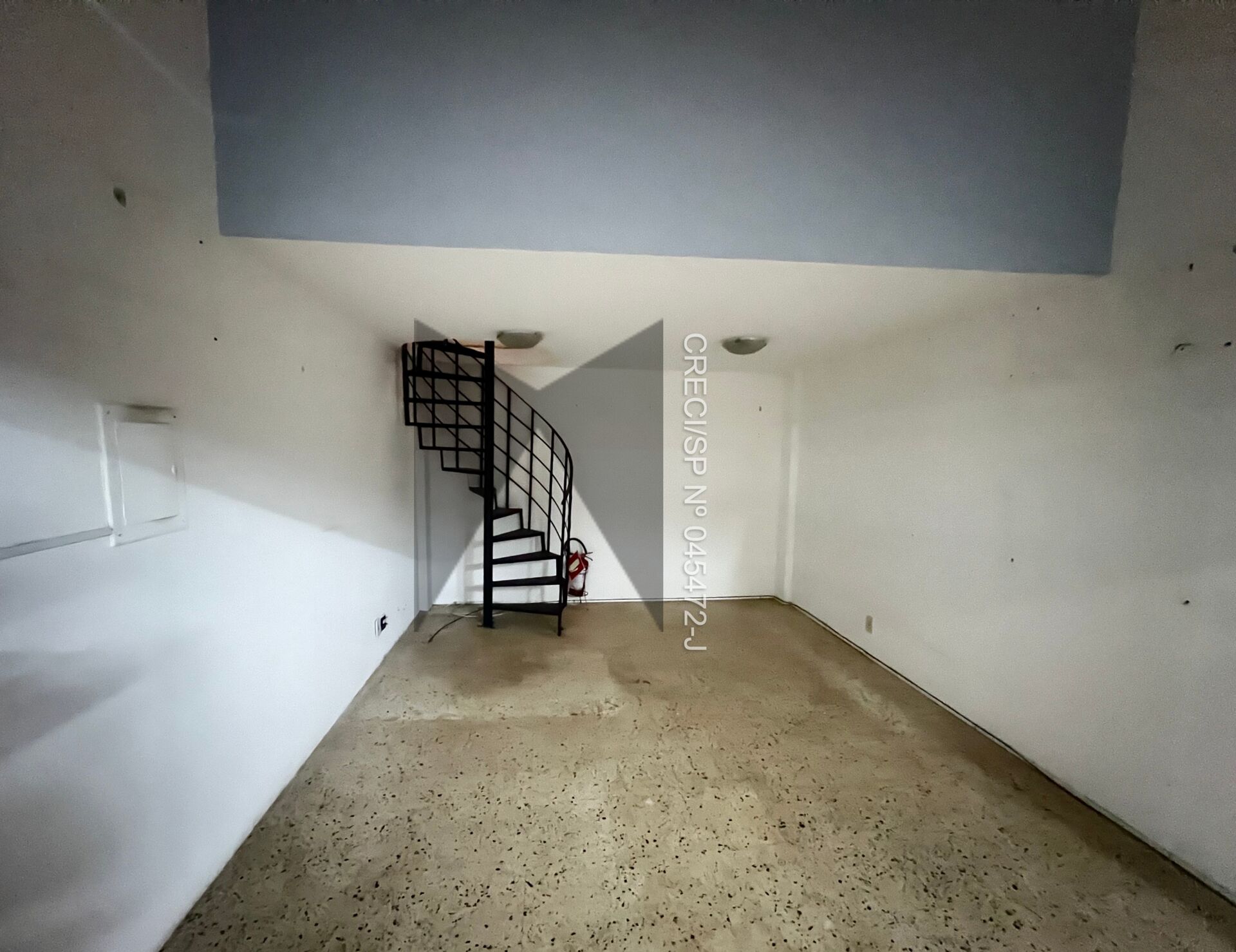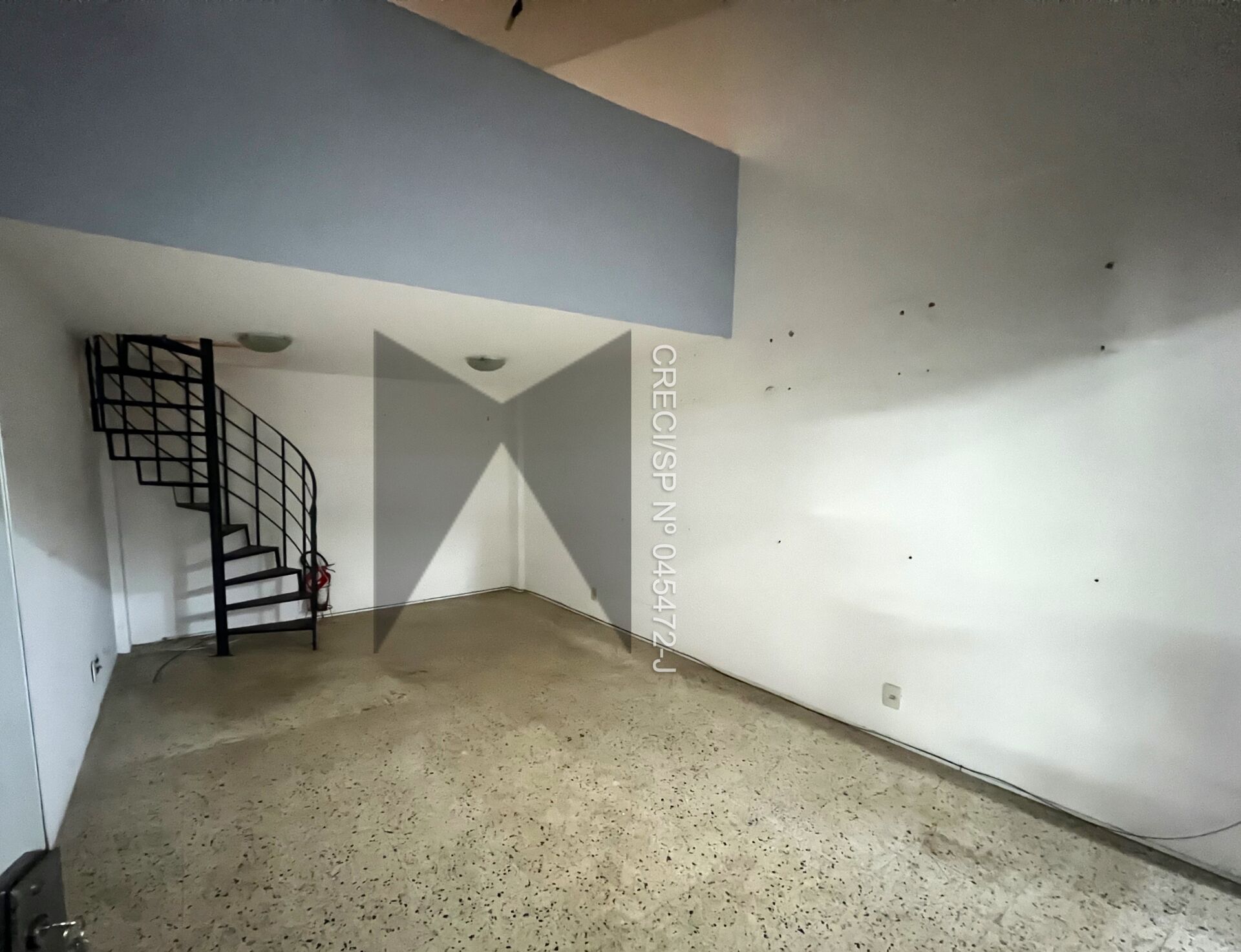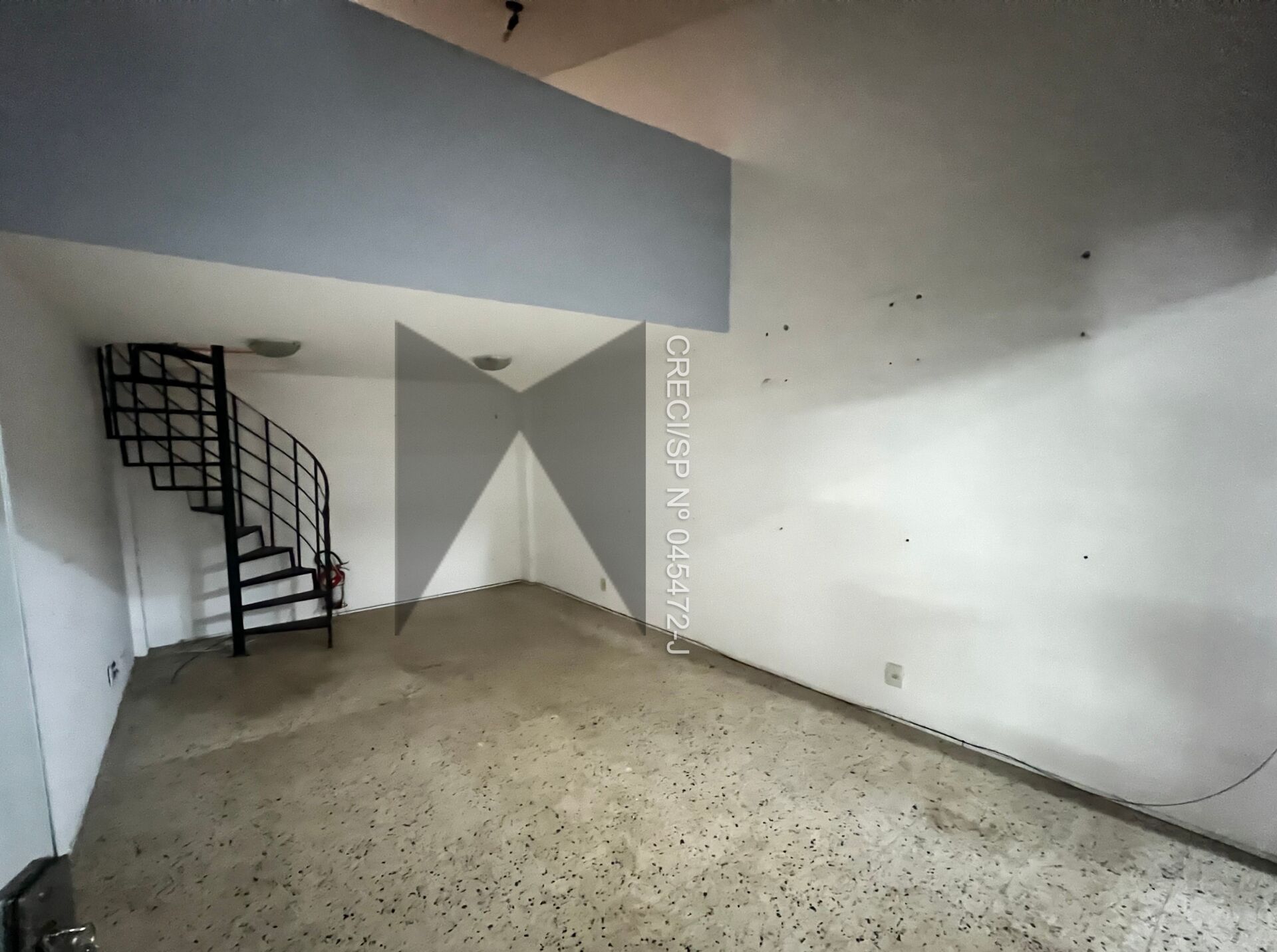 Sala comercial de 32,34m² de área privativa, com mezanino que pode ser aproveitado como cozinha ou depósito.